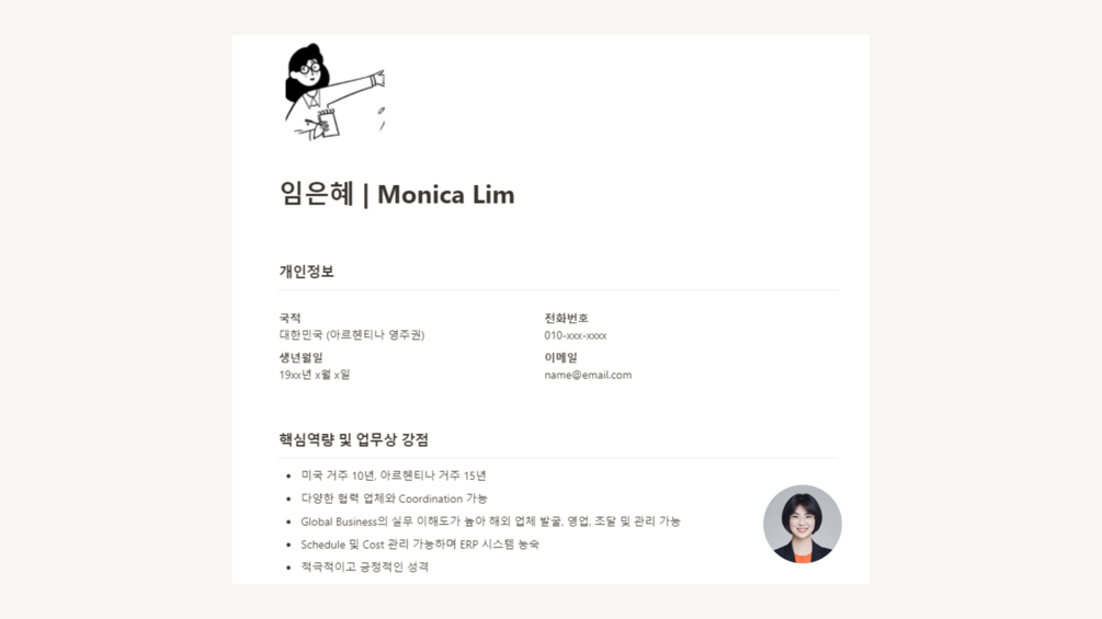 간단한 이력서, 노션으로 시작해보세요. 포트폴리오가 아닌 일반 이력서 포멧으로 제작한 템플릿입니다. 복제하시고, 자유롭게 변경하셔서 사용해보세요.
